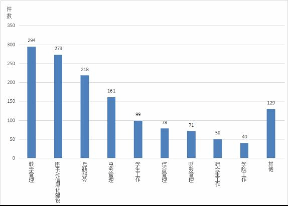 2015年,校长信箱服务平台共收到师生实名来信1413件,其中转呈校领导批示办理15件,移交相关单位内部处理51件,转交各单位办理1235件,另有112件未通过审核。来信人主要为学生,约占95%。反映的主要问题和建议如下图所示。