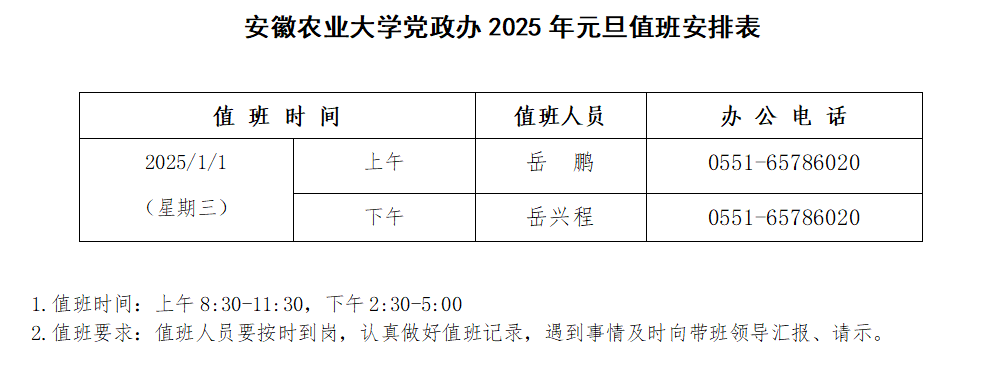 安徽农业大学党政办2025年元旦值班安排表