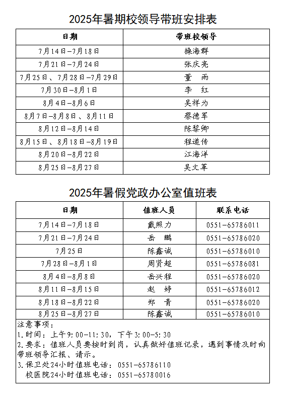 安徽农业大学党政办2025年暑期值班安排表